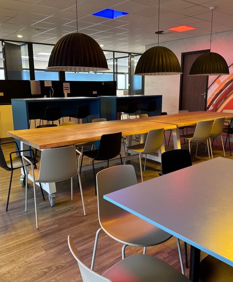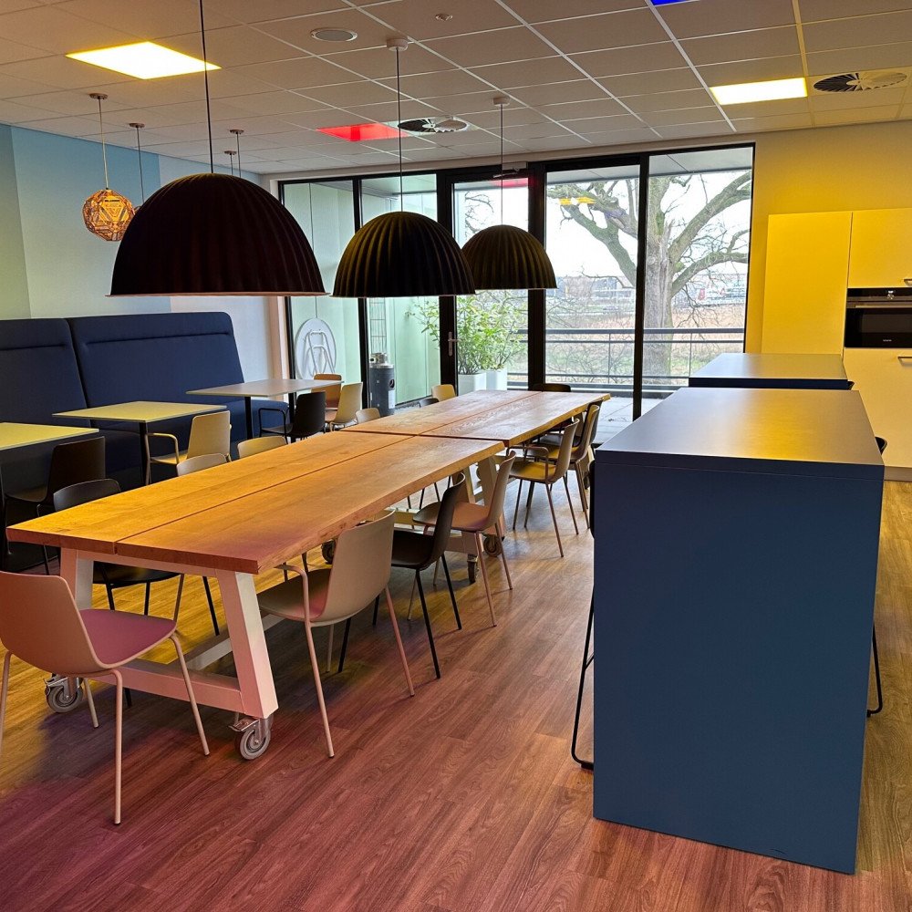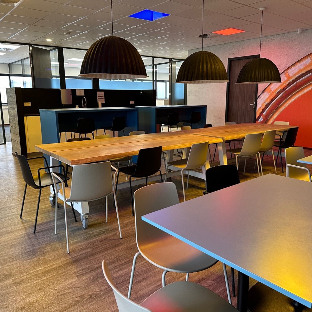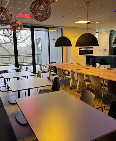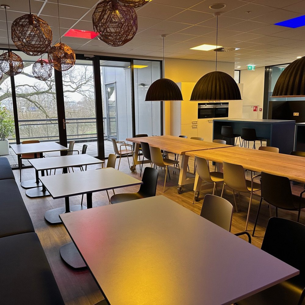 Bij deze ingerichte kantoorruimtes behoort tevens het gemeenschappelijk gebruik van de compleet ingerichte kantineruimte, voorzien van een keuken met o.a. oven, magnetron, vaatwasser, koelkast en Quooker. Daarnaast een gemeenschappelijke toiletgroep, garderobe, en buitenterras. Voldoende parkeergelegenheid en overdekte ruimte voor fietsen. Alle ruimtes zijn voorzien van airco, verwarming en boxen voor een gemeenschappelijke geluidsinstallatie. Een centrale patchkast zorgt voor internet (glasvezel) per kantoor.